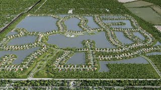 Large lakeside community with kayaking, trails, modern homes, and resort amenities